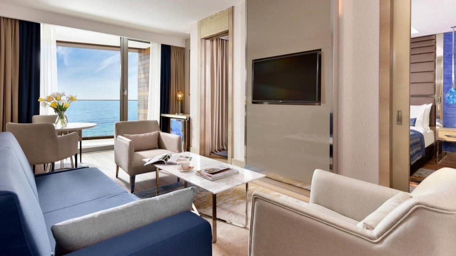 Junior Suitlerimizin tamamı panoramik deniz manzarasına sahip olup hem oturma odasında hem de yatak odasında balkon bulunur. Tavandan yere kadar uzanan pencereler balkona açılır ve oturma odasındaki balkonda iki adet konforlu sandalye ile kahve sehpası yer alır. Balkonda geçireceğiniz zamanın tadına doyamazken odanızda kendinizi evinizdeki kadar rahat hissedersiniz. Marin temalı çizgilerin sadelik ve rahatlık kattığı bu oda kategorisinde yatak odasında bir adet çift kişilik yatak ve oturma odasında bir adet açılabilir koltuk bulunur. Yer döşemesi anti-alerjik özelliği olan ve marin temasına uyumlu ahşap parkedir. Odadaki tüm detaylar konaklamanız boyunca konforunuz için size eşlik eder.