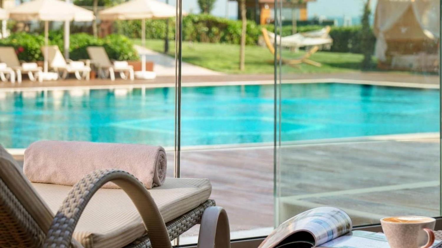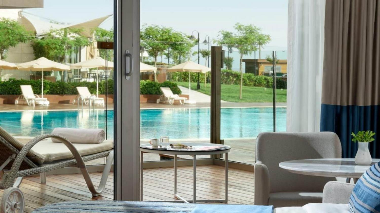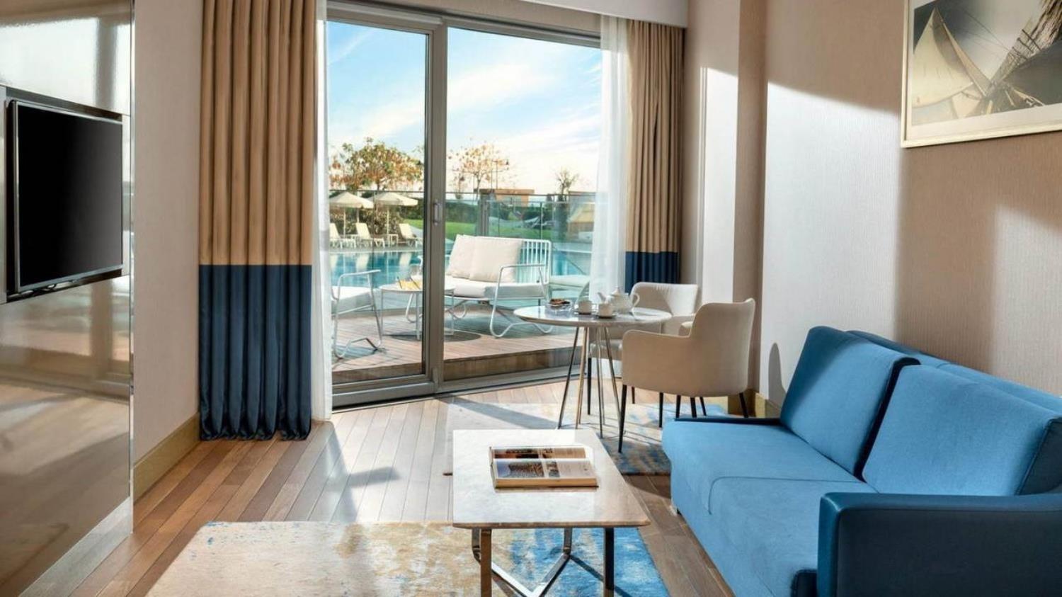 Şık mobilyalar ile dekore edilmiş ve doğrudan açık havuza erişimi bulunan size özel bir terasa sahiptir. Tavandan yere kadar uzanan pencereler sayesinde gün ışığını maksimum seviyede alır ve hem yatak odasındaki hem de oturma odasındaki pencereler terasa açılır. Marin temalı çizgilerin sadelik ve rahatlık kattığı bu oda kategorisinde bir adet çift kişilik yatak ve oturma odasında bir adet açılabilir koltuk bulunur. Odadaki tüm detaylar konaklamanız boyunca konforunuz için size eşlik eder.